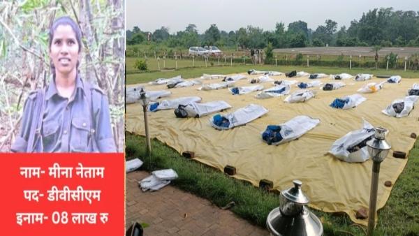 4. नाम - मीना नेताम उम्र - 44 वर्ष पद - डीव्हीसीएम पूर्वी बस्तर डिवीजन ,08 लाख ईनामी, निवासी ग्राम मोहंदी जिला नारायणपुर