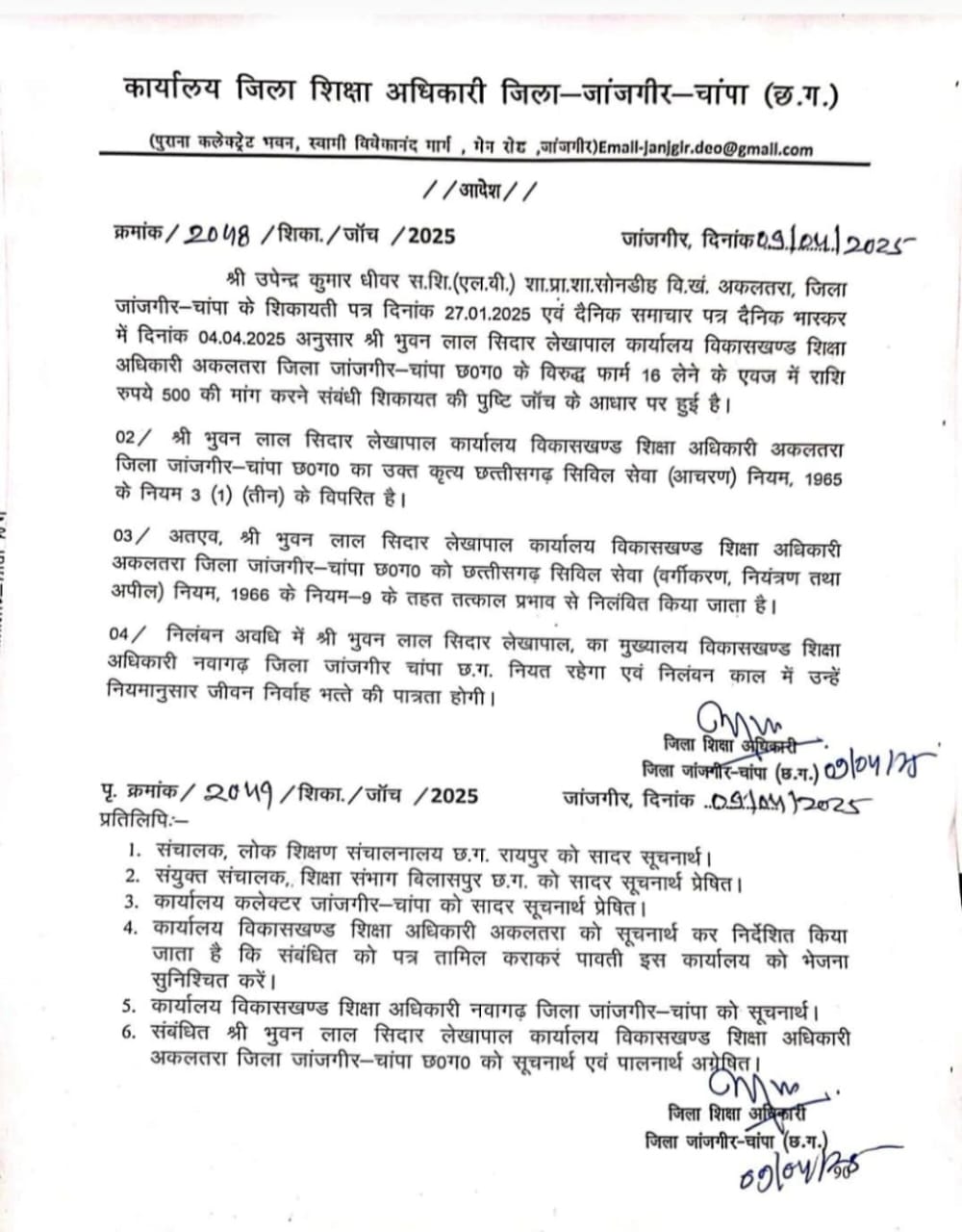 शिकायत में कहा गया था कि लेखापाल भुवन लाल सिदार ने फॉर्म-16 जारी करने के लिए ₹500 की मांग की थी। जांच के बाद इस शिकायत की पुष्टि हुई। इसके चलते भुवन लाल सिदार को छत्तीसगढ़ सिविल सेवा (वर्गीकरण, नियंत्रण तथा अपील) नियम, 1966 के नियम-9 के तहत तत्काल प्रभाव से निलंबित कर दिया गया है। निलंबन अवधि के दौरान उनका मुख्यालय विकासखण्ड शिक्षा अधिकारी, नवागढ़ जिला जांजगीर-चांपा नियत किया गया है।