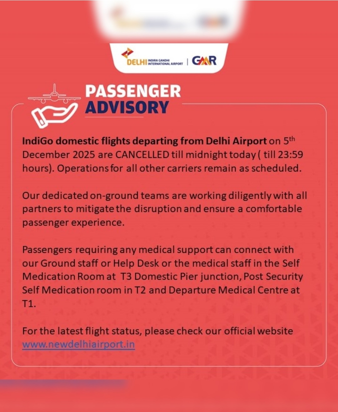 BREAKING NEWS: दिल्ली एयरपोर्ट ने यात्री परामर्श जारी किया है कि आज आधी रात तक IndiGo की सभी घरेलू उड़ानें रद्द कर दी गई हैं। एयरलाइन ने बताया कि यह निर्णय पायलट और क्रू की कमी, नए ड्यूटी नियम, मौसम और हवाई यातायात की भीड़ जैसी वजहों से लिया गया है। अन्य सभी एयरलाइंस अपनी निर्धारित उड़ानों के अनुसार संचालन जारी रखेंगी।
