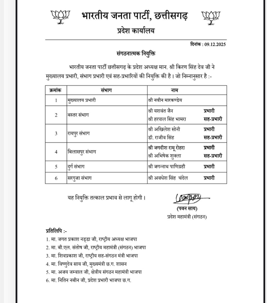 रायपुर: प्रदेश भाजपा ने अपने संभागीय संगठन प्रभारियों की घोषणा कर दी है। पार्टी ने पूर्व विधायक नवीन मारकंडेय को मुख्यालय प्रभारी नियुक्त किया है। वहीं, प्रदेश महामंत्री अखिलेश सोनी को रायपुर संभाग का प्रभारी बनाया गया है। इस संभाग में डॉ. राजीव सिंह को सह प्रभारी के रूप में जिम्मेदारी सौंपी गई है।
