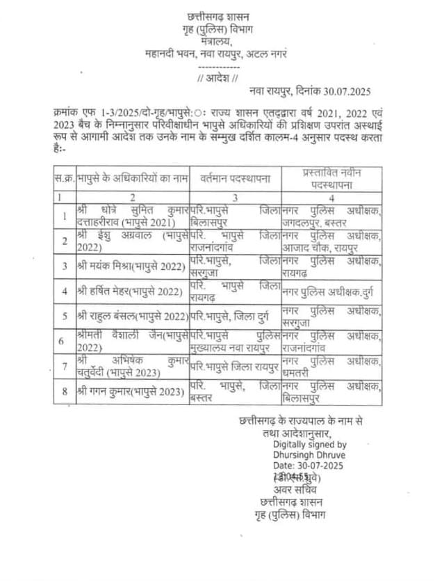 रायपुर। छत्तीसगढ़ गृह पुलिस विभाग ने हाल ही में आठ युवा आईपीएस (भारतीय पुलिस सेवा) अधिकारियों को नई जिम्मेदारियां सौंपी हैं। यह आदेश 2021, 2022 और 2023 बैच के उन अधिकारियों के लिए जारी किया गया है, जिन्होंने अपना प्रोबेशनरी पीरियड (परीवीक्षाधीन अवधि) सफलतापूर्वक पूरा कर लिया है।