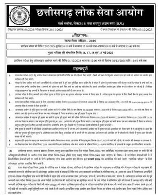 रायपुर। Chhattisgarh Public Service Commission (सीजीपीएससी) ने आगामी परीक्षा को लेकर अभ्यर्थियों के लिए विस्तृत दिशा-निर्देश जारी किए हैं। आयोग ने स्पष्ट किया है कि नियमों का उल्लंघन करने पर सख्त कार्रवाई की जाएगी।