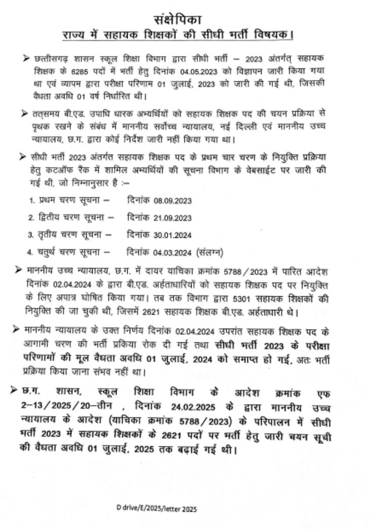 रायपुर। छत्तीसगढ़ के स्कूल शिक्षा विभाग ने सहायक शिक्षक सीधी भर्ती प्रक्रिया–2023 को औपचारिक रूप से समाप्त करने का निर्णय लिया है। भर्ती प्रक्रिया के दौरान उत्पन्न हुई कानूनी बाधाओं, न्यायालयीन आदेशों और समयसीमा समाप्त होने के कारण यह फैसला लिया गया है। विभाग का कहना है कि अब इस भर्ती के तहत आगे कोई नियुक्ति संभव नहीं है।