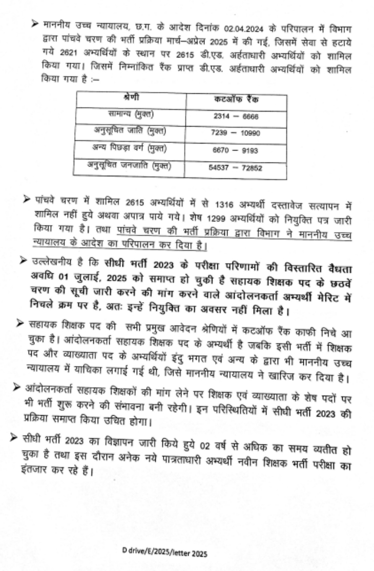 भर्ती परिणाम की बढ़ी हुई वैधता 1 जुलाई 2025 को समाप्त हो चुकी है। विभाग ने स्पष्ट किया है कि छठवें चरण की मांग कर रहे अभ्यर्थी मेरिट सूची में काफी नीचे हैं, इसलिए उन्हें नियुक्ति का अवसर नहीं दिया जा सकता।
