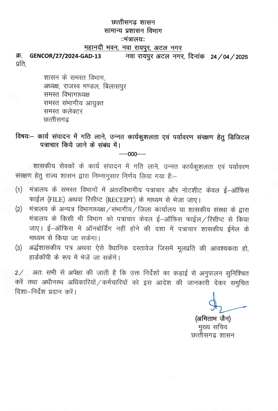 Efforts to make government work paperless have begun CS Amitabh Jain has written a letter to all departments and collectors