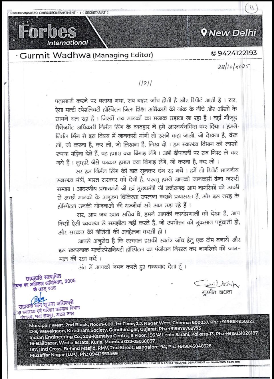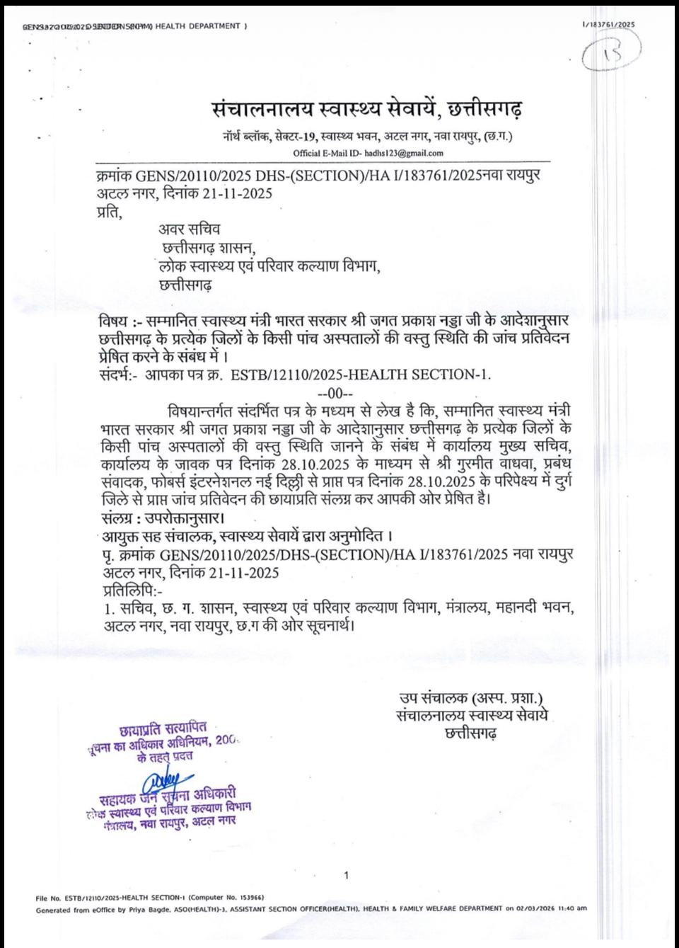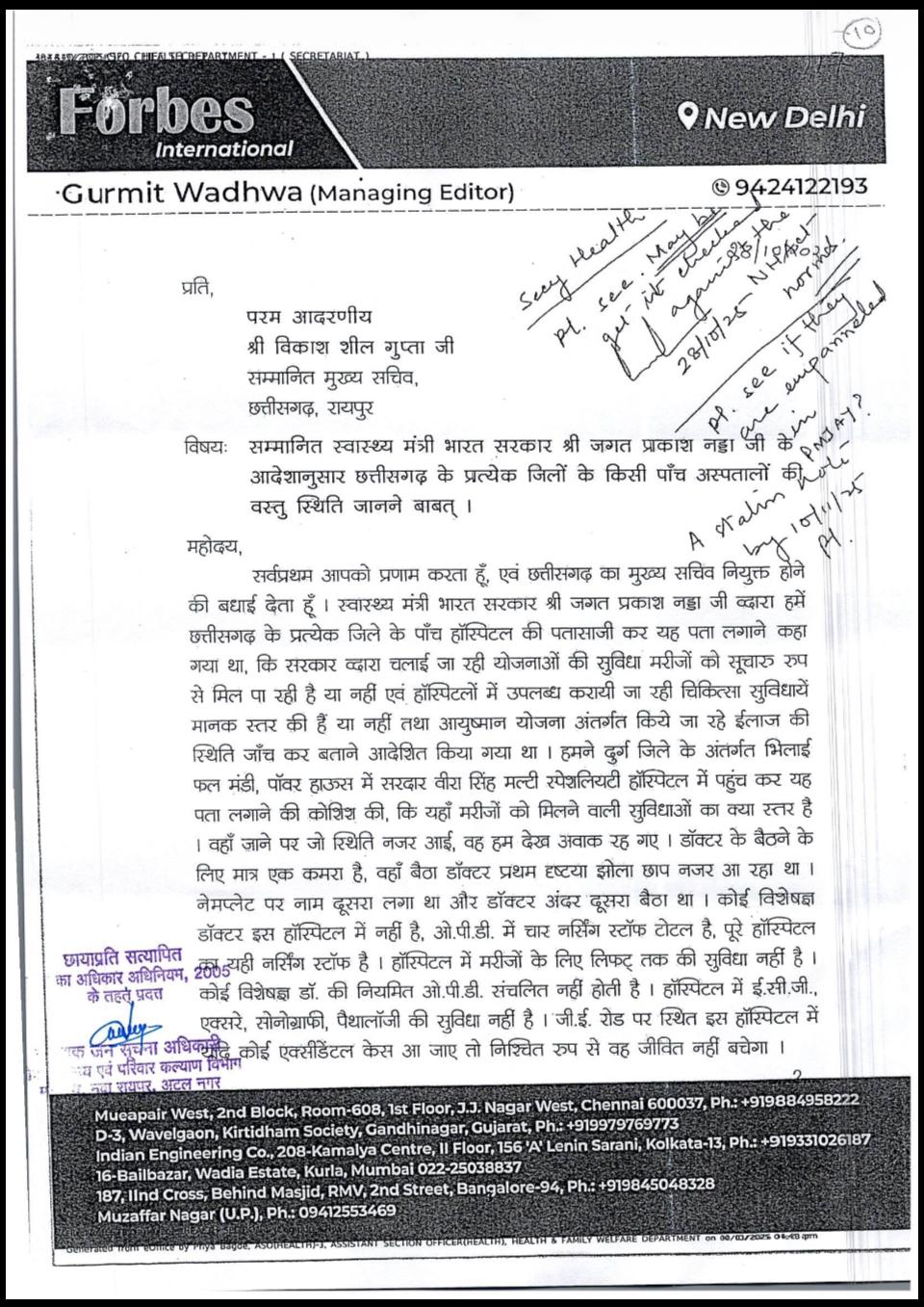 इस पत्र में उसने केंद्रीय स्वास्थ्य मंत्री जेपी नड्डा के नाम का हवाला देते हुए दावा किया कि उसे छत्तीसगढ़ के अस्पतालों की जांच का अधिकार मिला है।