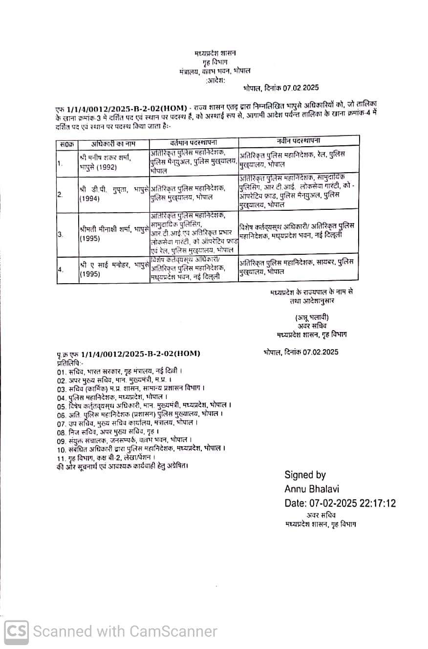 इसके अलावा एडीजी पुलिस मैनुअल पीएचक्यू मनीष शंकर शर्मा को एडीजी रेल पुलिस मुख्यालय पदस्थ किया है। वहीं, एडीजी पुलिस मुख्यालय डीपी गुप्ता को एडीजी सामुदायिक पुलिसिंग, आरटीआई, लोक सेवा गारंटी, कोऑपरेटिव फ्रॉड और पुलिस मैनुअल की जिम्मेदारी सौंपी गई है। तबादला आदेश में एडीजी सामुदायिक पुलिसिंग, आरटीआई और लोकसेवा गारंटी मीनाक्षी शर्मा को ओएसडी मध्य प्रदेश भवन नई दिल्ली पदस्थ किया है।