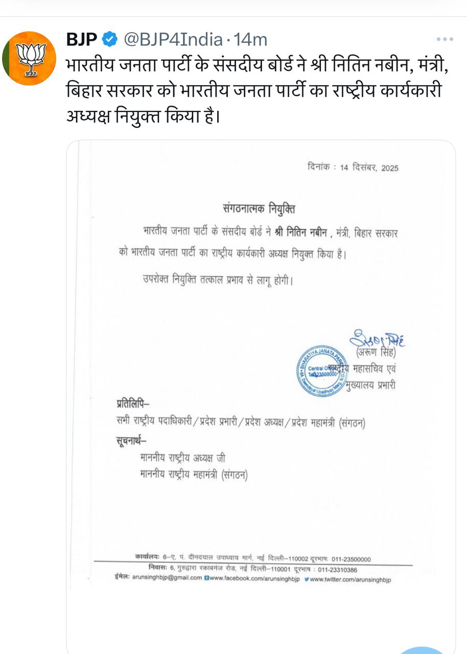 नई दिल्ली। भारतीय जनता पार्टी (बीजेपी) ने बड़ा संगठनात्मक बदलाव करते हुए बिहार सरकार के मंत्री नितिन नवीन को पार्टी का राष्ट्रीय कार्यकारी अध्यक्ष नियुक्त किया है।