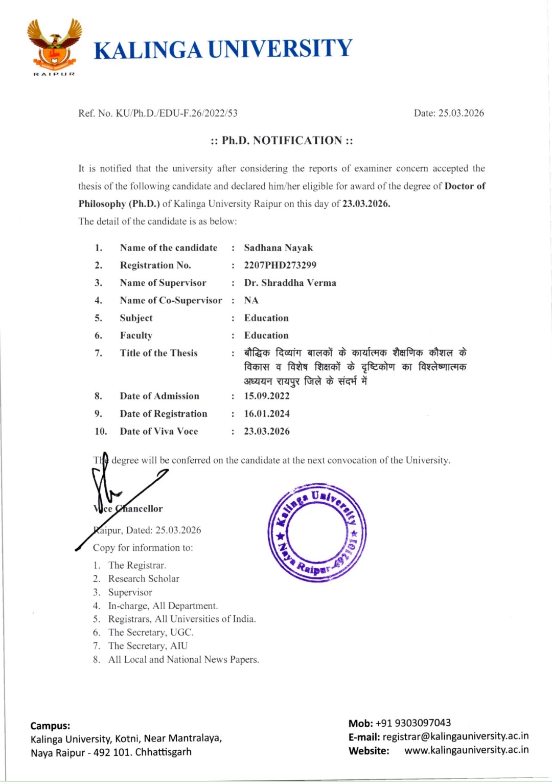 रायपुर। बौद्धिक दिव्यांग बच्चों की शिक्षा के लिए समर्पित और मध्यभारत के सबसे प्रतिष्ठित संस्थान आकांक्षा लायन्स इंस्टीट्यूट ऑफ लर्निंग एण्ड एम्पॉवरमेन्ट की डायरेक्टर श्रीमती साधना नायक को पीएचडी अवार्ड हुई है।कलिंगा विश्वविद्यालय ने उनकी पीएचडी का नोटिफिके़शन जारी कर दिया है।