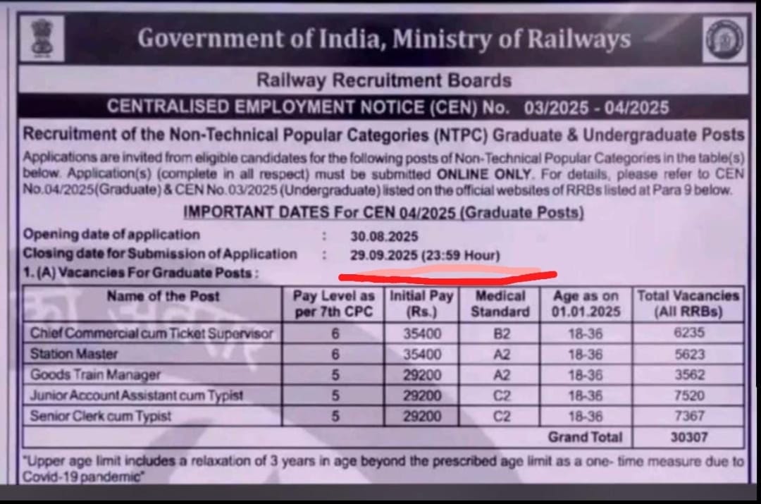 RRBs vacancies:भारत सरकार, रेल मंत्रालय केंद्रीकृत रोजगार सूचना संख्या 03/2025 और 04/2025 के अंतर्गत गैर-तकनीकी लोकप्रिय श्रेणियों यानी एनटीपीसी के स्नातक एवं स्नातक पूर्व पदों के लिए भर्ती प्रक्रिया शुरू की जा रही है। इसके लिए पात्र अभ्यर्थियों से केवल ऑनलाइन माध्यम से आवेदन आमंत्रित किए गए हैं। आवेदन की पूरी जानकारी संबंधित सीईएन 04/2025 (स्नातक पदों हेतु) और सीईएन 03/2025 (स्नातक पूर्व पदों हेतु) में दी गई है जो सभी रेलवे भर्ती बोर्डों की आधिकारिक वेबसाइटों पर उपलब्ध है।