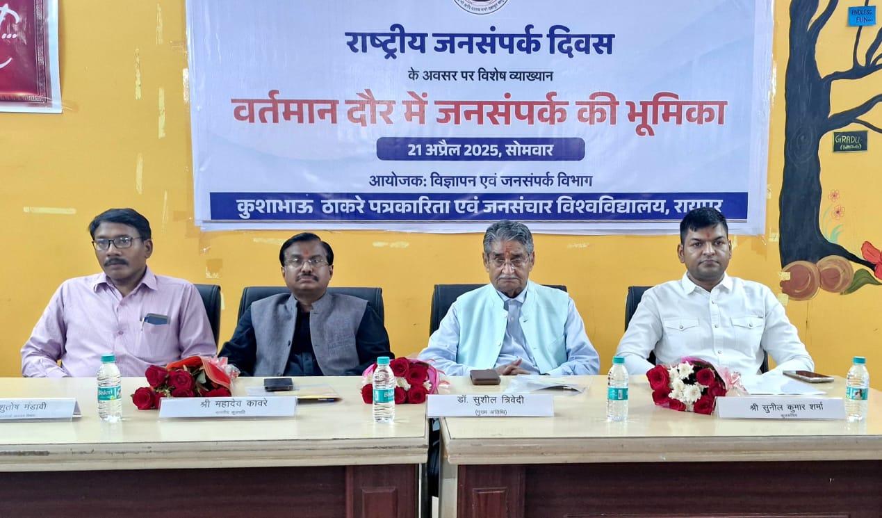 रायपुर। छत्तीसगढ़ की राजधानी रायपुर के कुशाभाऊ ठाकरे पत्रकारिता एवं जनसंचार विश्वविद्यालय में आज राष्ट्रीय जनसंपर्क दिवस के अवसर पर वर्तमान समय में जनसंपर्क की भूमिका पर व्याख्यान आयोजित किया गया।