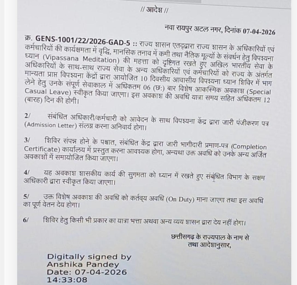 रायपुर। दफ्तर के कामकाज और अन्य कारणों से बढ़ते तनाव को कम करने के लिए राज्य सरकार ने अधिकारियों और कर्मचारियों को बड़ी राहत दी है। अब वे विपश्यना साधना शिविर में शामिल होकर मानसिक शांति पा सकेंगे, जिसके लिए उन्हें विशेष आकस्मिक अवकाश (सीएल) भी दिया जाएगा।