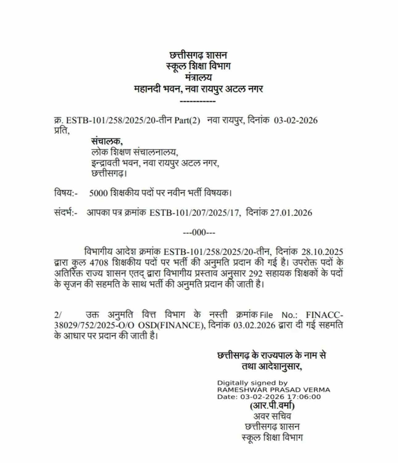 (CG Teacher Recruitment) गौरतलब है कि इससे पहले 28 अक्टूबर 2025 को राज्य सरकार द्वारा 4708 शिक्षकीय पदों पर भर्ती की स्वीकृति दी गई थी। अब राज्य सरकार के निर्देश और विभागीय प्रस्ताव के तहत 292 सहायक शिक्षक पदों के सृजन को भी मंजूरी दे दी गई है। इन सभी पदों को मिलाकर अब कुल 5000 शिक्षकीय पदों पर भर्ती का मार्ग प्रशस्त हो गया है।