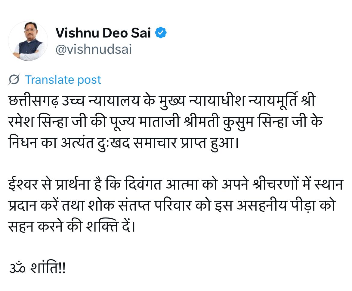 मुख्य न्यायाधीश की मां के निधन पर प्रदेश के मुख्यमंत्री विष्णु देव साय ने दुख व्यक्त किया है। उन्होंने अपने एक X पोस्ट पर लिखा-छत्तीसगढ़ उच्च न्यायालय के मुख्य न्यायाधीश न्यायमूर्ति श्री रमेश सिन्हा जी की पूज्य माताजी श्रीमती कुसुम सिन्हा जी के निधन का अत्यंत दुःखद समाचार प्राप्त हुआ।