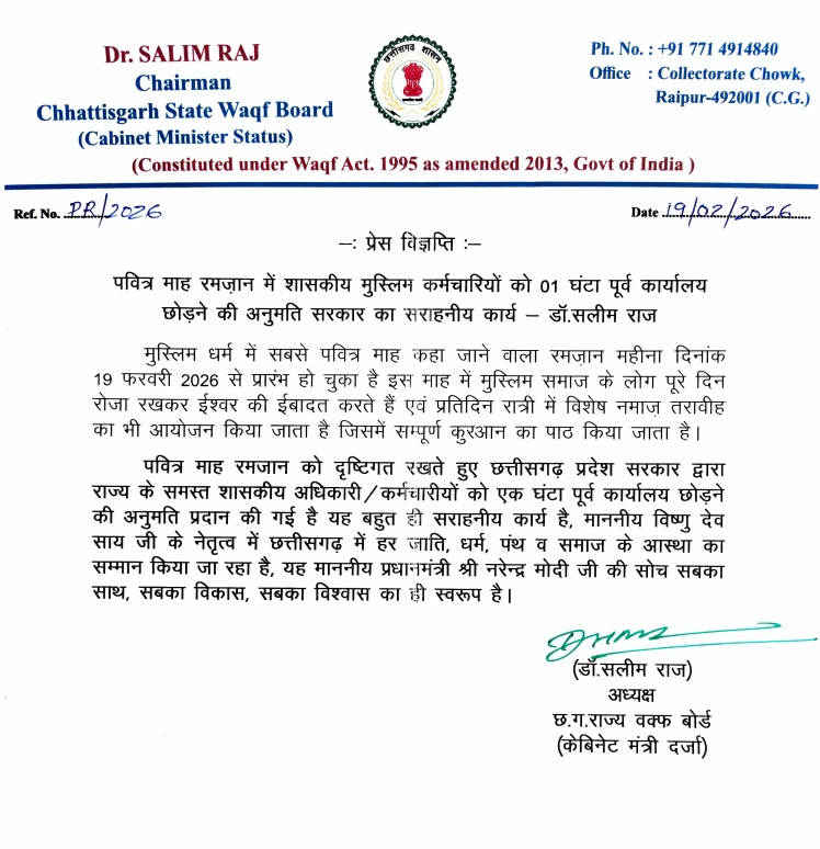 छत्तीसगढ़ राज्य वक्फ बोर्ड के अध्यक्ष डॉ. सलीम राज ने इस आदेश का स्वागत करते हुए कहा कि यह निर्णय धार्मिक आस्था और सामाजिक समरसता के सम्मान की दिशा में महत्वपूर्ण पहल है। उन्होंने इसे पवित्र माह रमज़ान के दृष्टिगत सराहनीय कदम बताया और कर्मचारियों को राहत पहुंचाने वाला कदम करार दिया।
