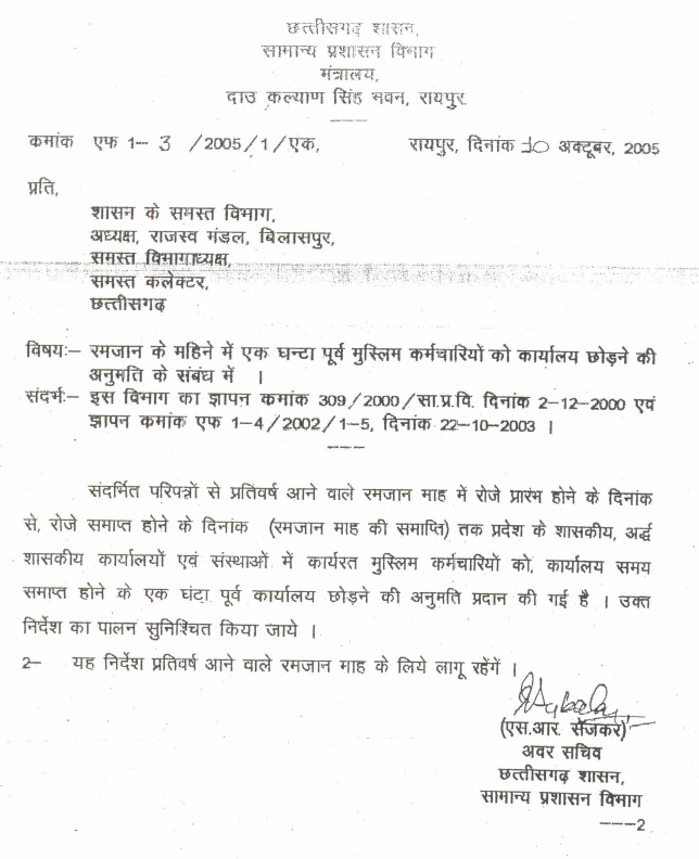 छत्तीसगढ़ शासन के सामान्य प्रशासन विभाग द्वारा जारी आदेश के अनुसार, रमज़ान माह में रोज़ा रखने वाले कर्मचारियों को अपने धार्मिक कर्तव्यों के पालन में सहूलियत देने के लिए कार्यालय समय समाप्त होने से एक घंटा पूर्व कार्यालय छोड़ने की अनुमति दी गई है। शासन ने इस आदेश के पालन को सुनिश्चित करने के भी निर्देश जारी किए हैं।