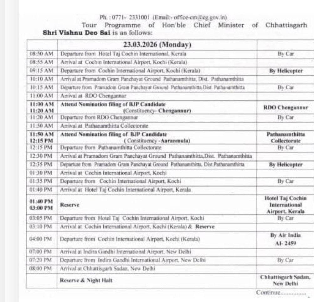 सीएम साय सबसे पहले चेनगानूर विधानसभा क्षेत्र जाएंगे, जहां वे भाजपा प्रत्याशी के नामांकन कार्यक्रम में हिस्सा लेंगे। इसके बाद वे पटनमथिटा विधानसभा क्षेत्र के लिए रवाना होंगे।