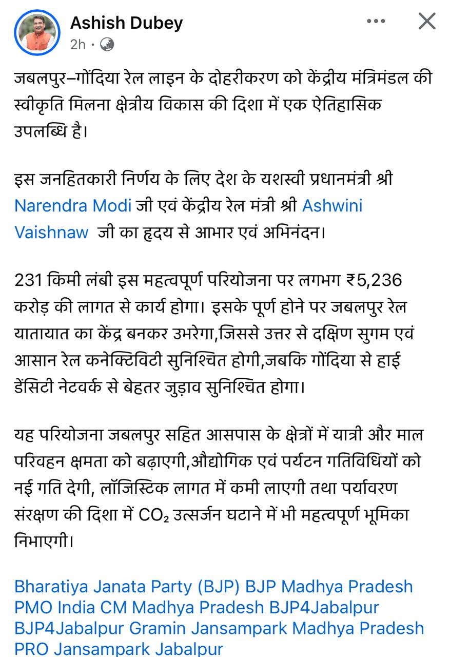 उन्होंने अपनी एक सोशल मीडिया पोस्ट पर लिखा- जबलपुर–गोंदिया रेल लाइन के दोहरीकरण को केंद्रीय मंत्रिमंडल की स्वीकृति मिलना क्षेत्रीय विकास की दिशा में एक ऐतिहासिक उपलब्धि है।