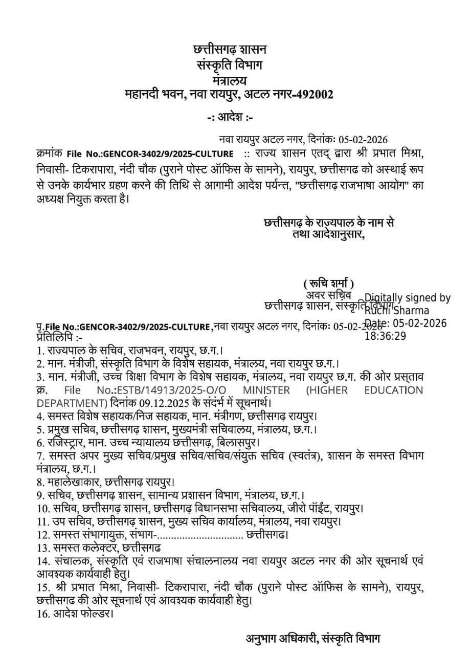 रायपुर। छत्तीसगढ़ शासन के संस्कृति विभाग ने एक आदेश जारी करते हुए प्रभात मिश्रा को छत्तीसगढ़ राजभाषा आयोग का अध्यक्ष नियुक्त किया है। विभाग द्वारा जारी आदेश में स्पष्ट किया गया है कि यह नियुक्ति तत्काल प्रभाव से लागू होगी।