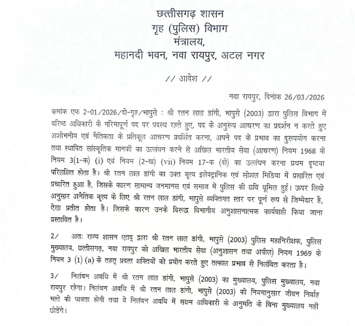 छत्तीसगढ़ पुलिस प्रशासन में एक बड़ा घटनाक्रम सामने आया है। राज्य सरकार ने वरिष्ठ IPS अधिकारी रतनलाल डांगी को निलंबित कर दिया है। यह कदम ऐसे समय में उठाया गया है जब डांगी पहले से ही गंभीर विवाद में घिरे हुए थे।