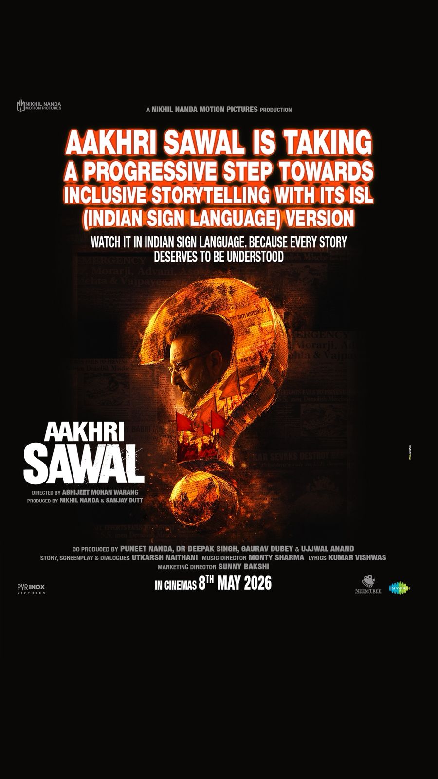 बॉलीवुड अभिनेता Sanjay Dutt की आगामी फिल्म ‘आख़िरी सवाल’ अपने अनोखे विषय के साथ-साथ अब अपने संवेदनशील प्रस्तुतीकरण को लेकर भी चर्चा में है। फिल्म के मेकर्स ने एक सराहनीय पहल करते हुए इसके टीज़र को इंडियन साइन लैंग्वेज (ISL) में भी जारी किया है, ताकि श्रवण बाधित दर्शक भी फिल्म की कहानी और भावनाओं से जुड़ सकें।